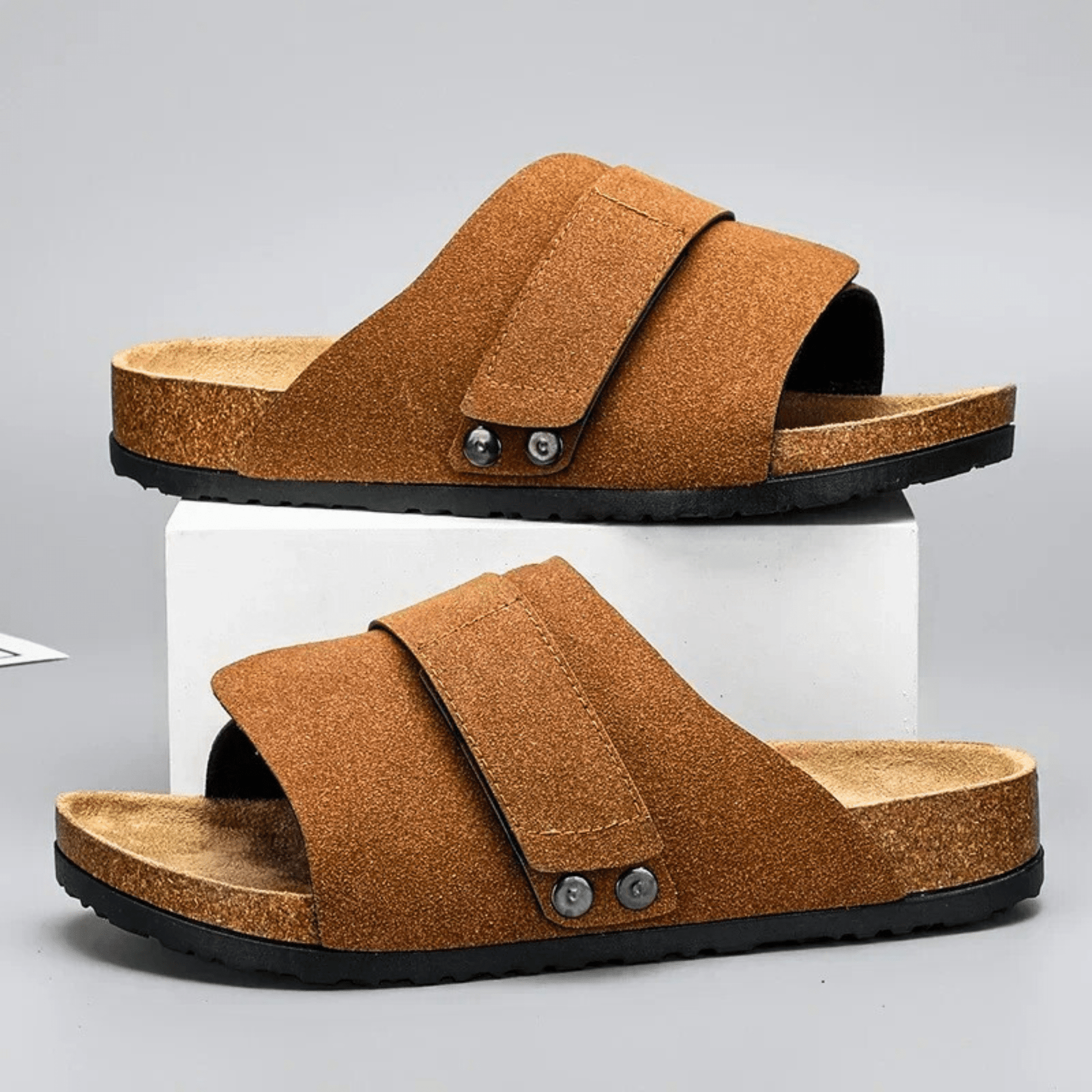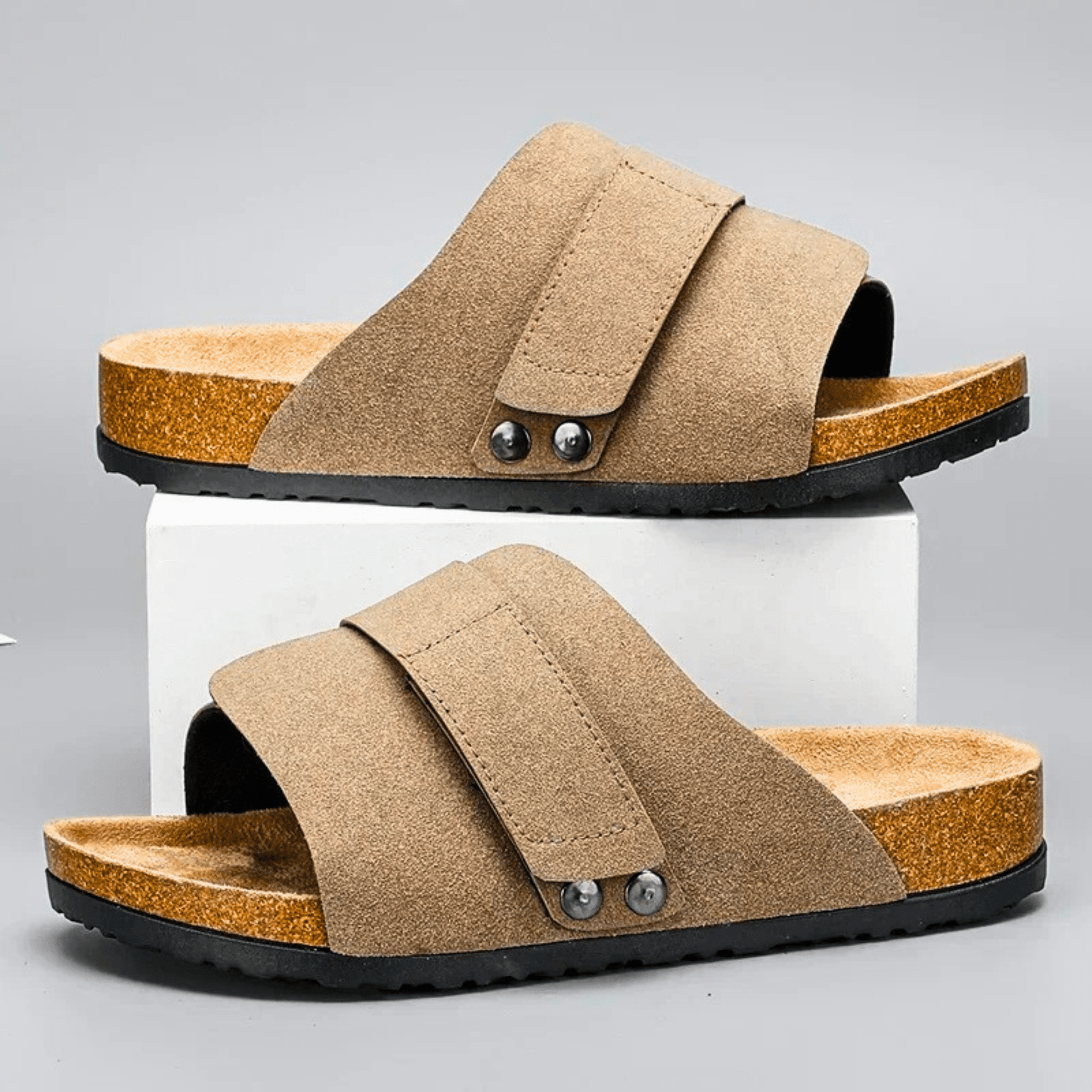 Crafted with a premium suede finish and a flexible, shock-absorbing cork insole for all-day comfort and style. Featuring a sleek velcro closure for a secure fit, they are the perfect warm-weather essential for spring and summer.