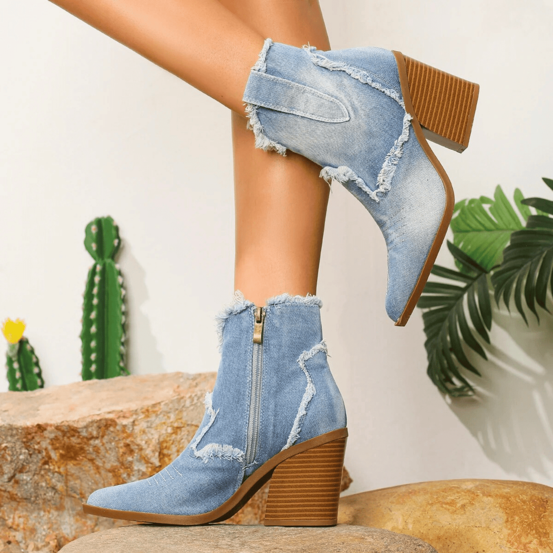 Crafted from durable denim with a chic zip up ankle-length design these boots were made for walkin! With a comfortable insole and sturdy bottom heel you'll effortlessly enjoy two-stepping or just about anything else in these rodeo ready booties.