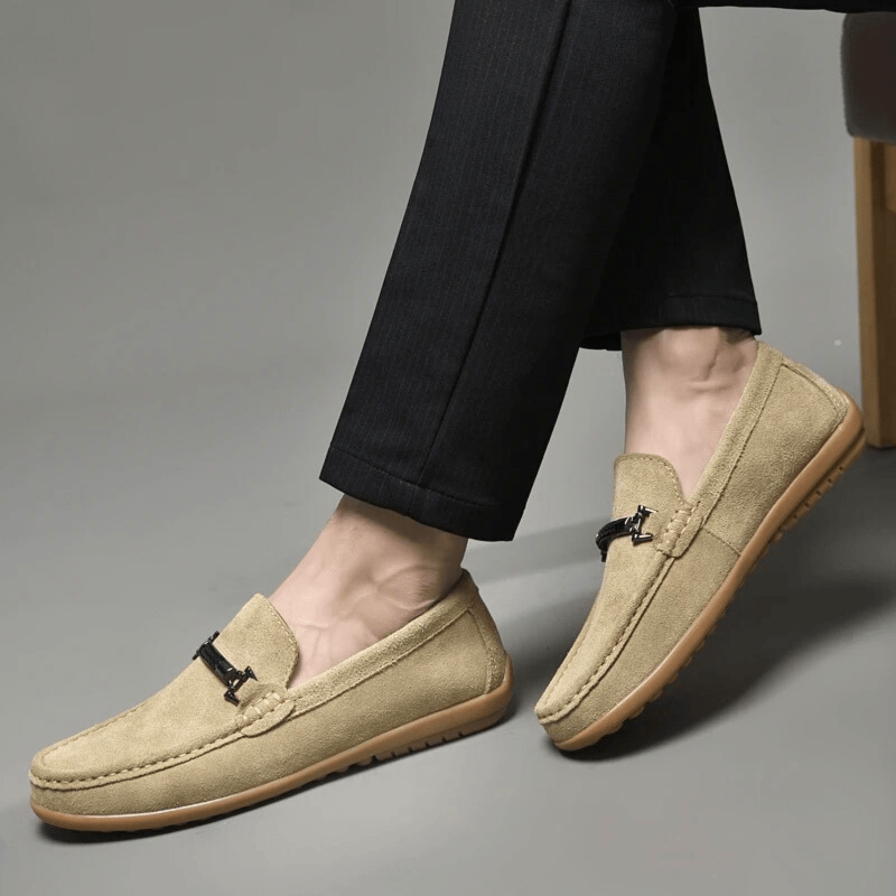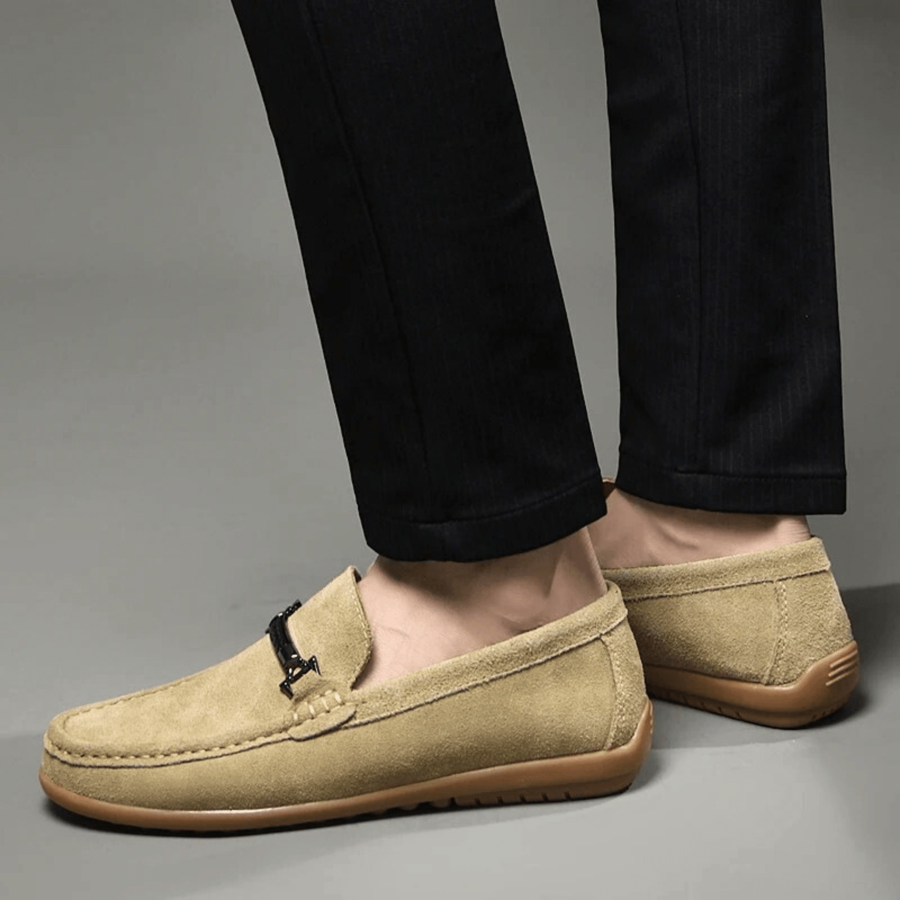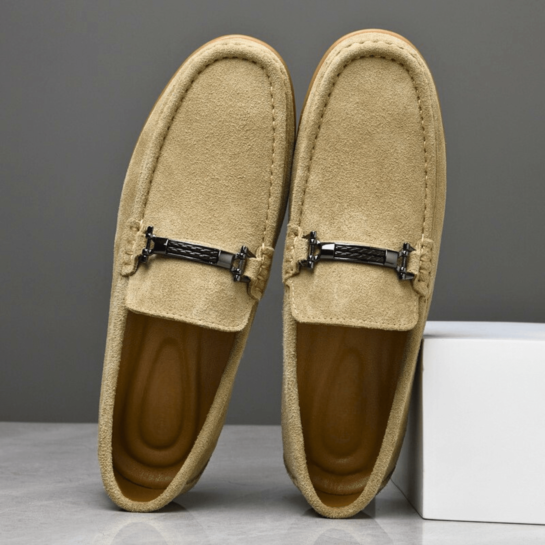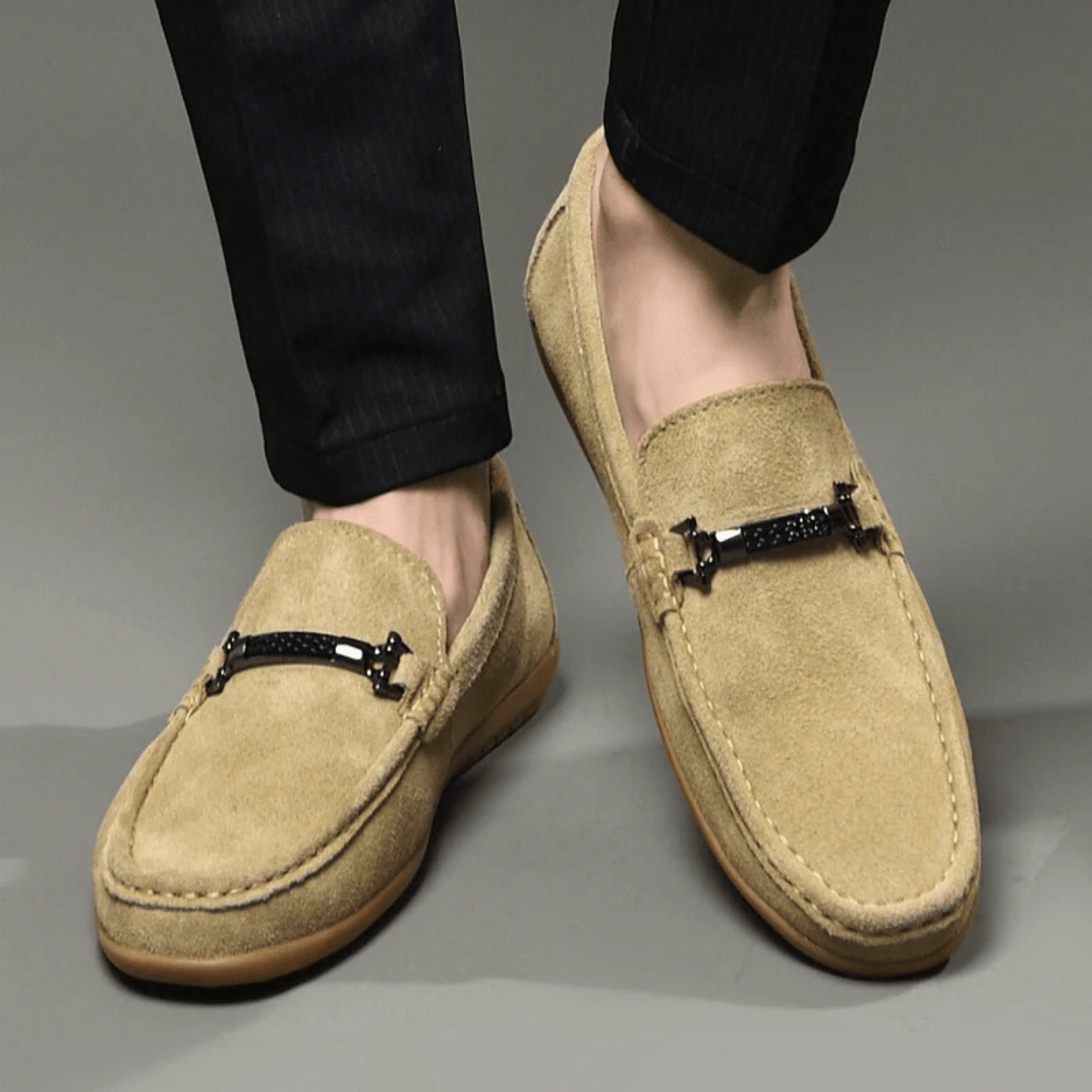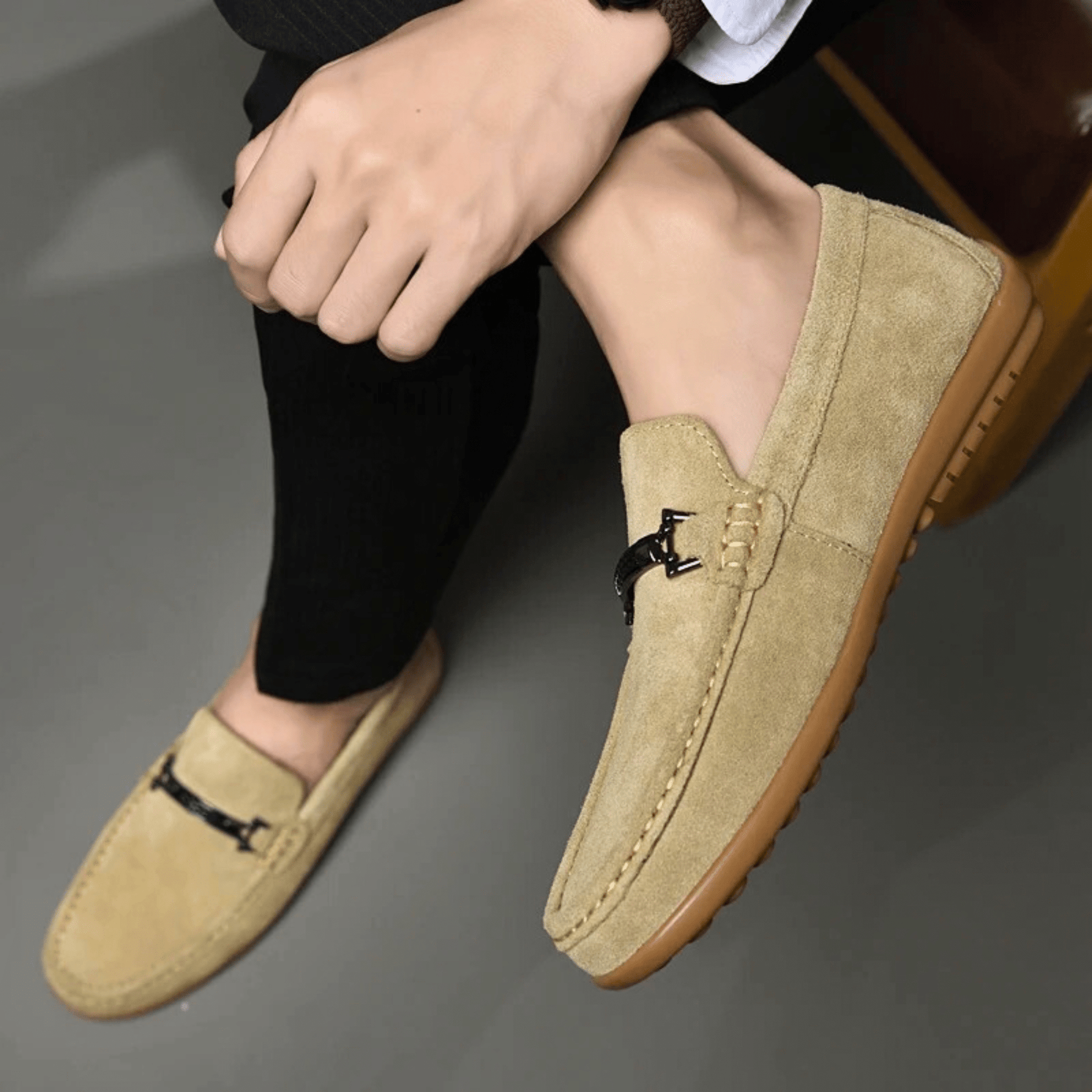 Crafted from genuine Italian suede leather with designer buckle detailing for a refined, modern look. Featuring a cushioned insole, ergonomic arch support, and a non-slip outsole, they deliver luxurious comfort with every step.