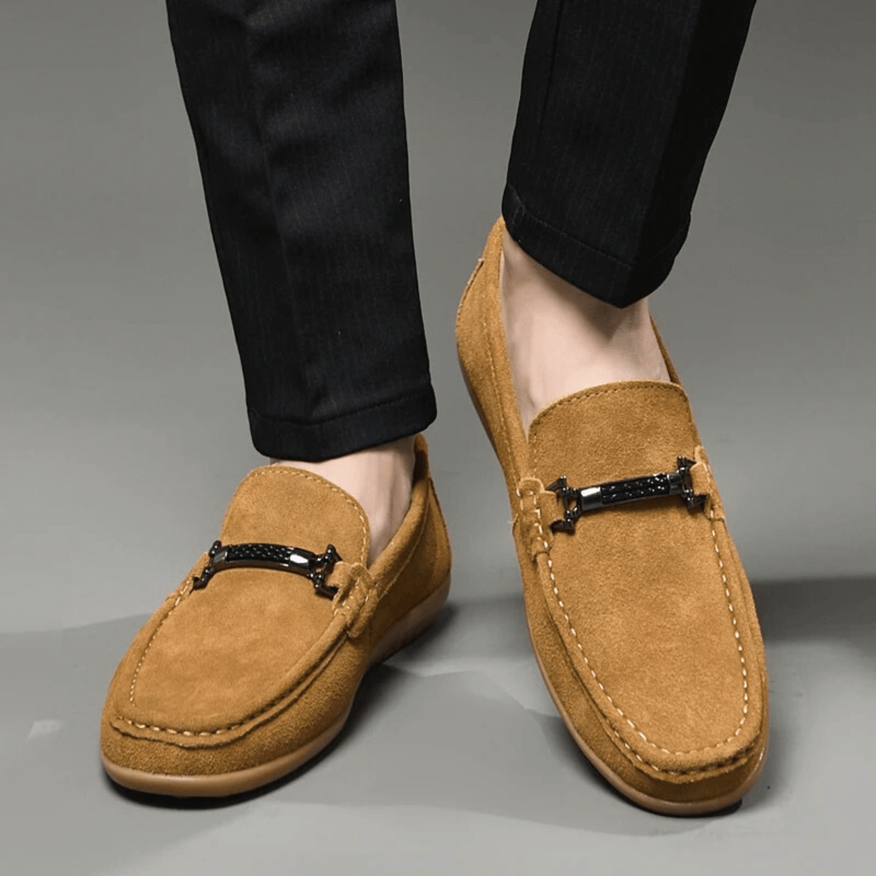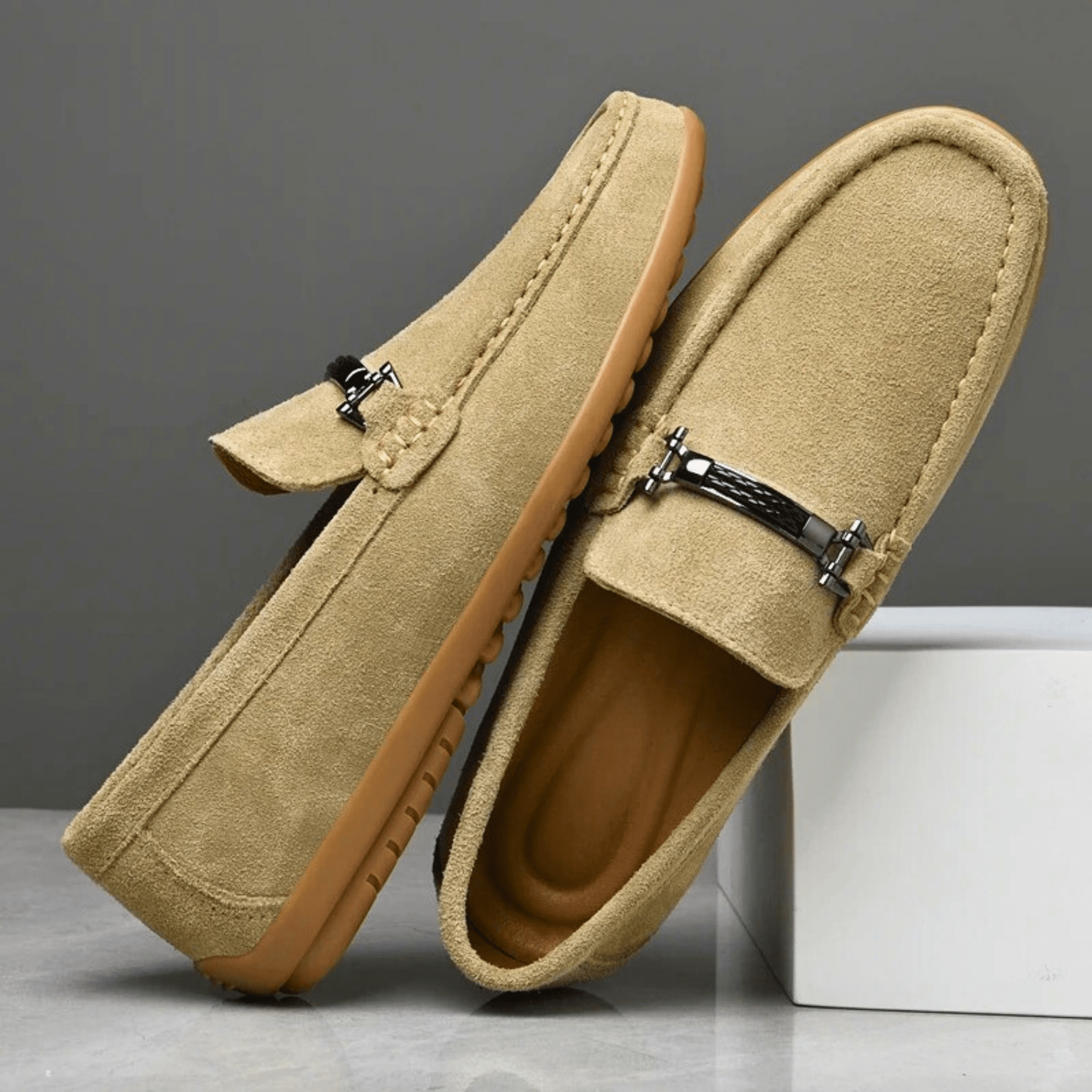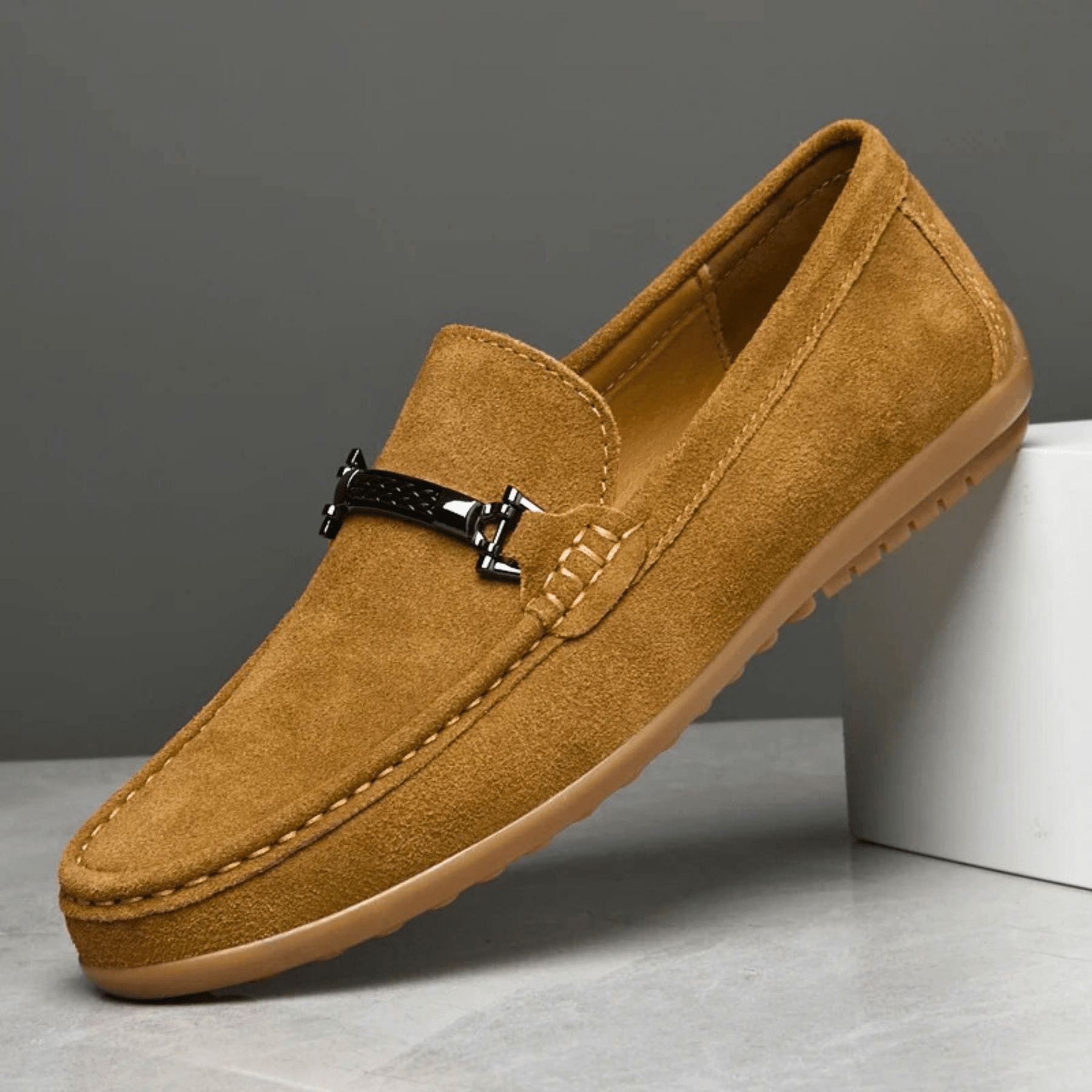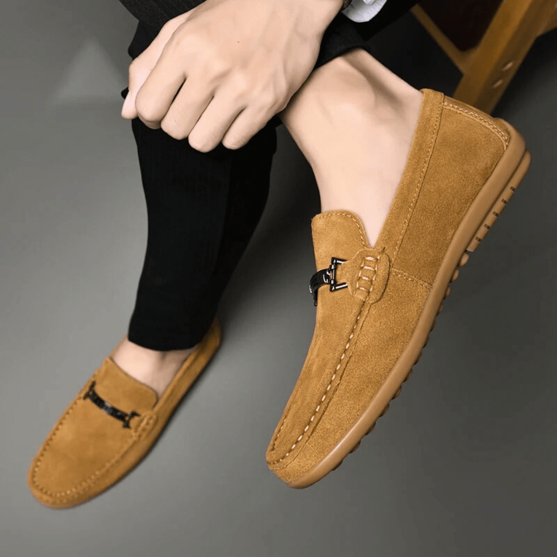 Crafted from genuine Italian suede leather with designer buckle detailing for a refined, modern look. Featuring a cushioned insole, ergonomic arch support, and a non-slip outsole, they deliver luxurious comfort with every step.