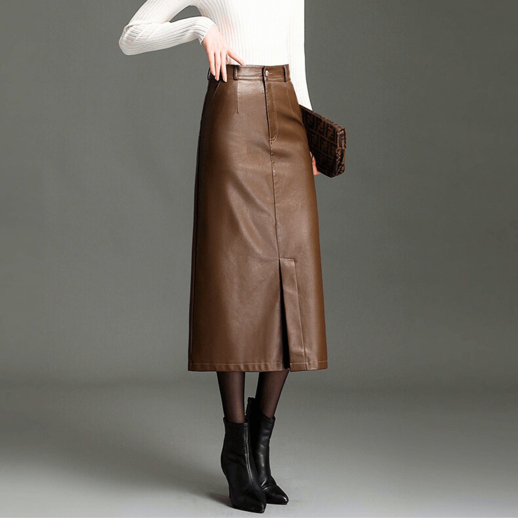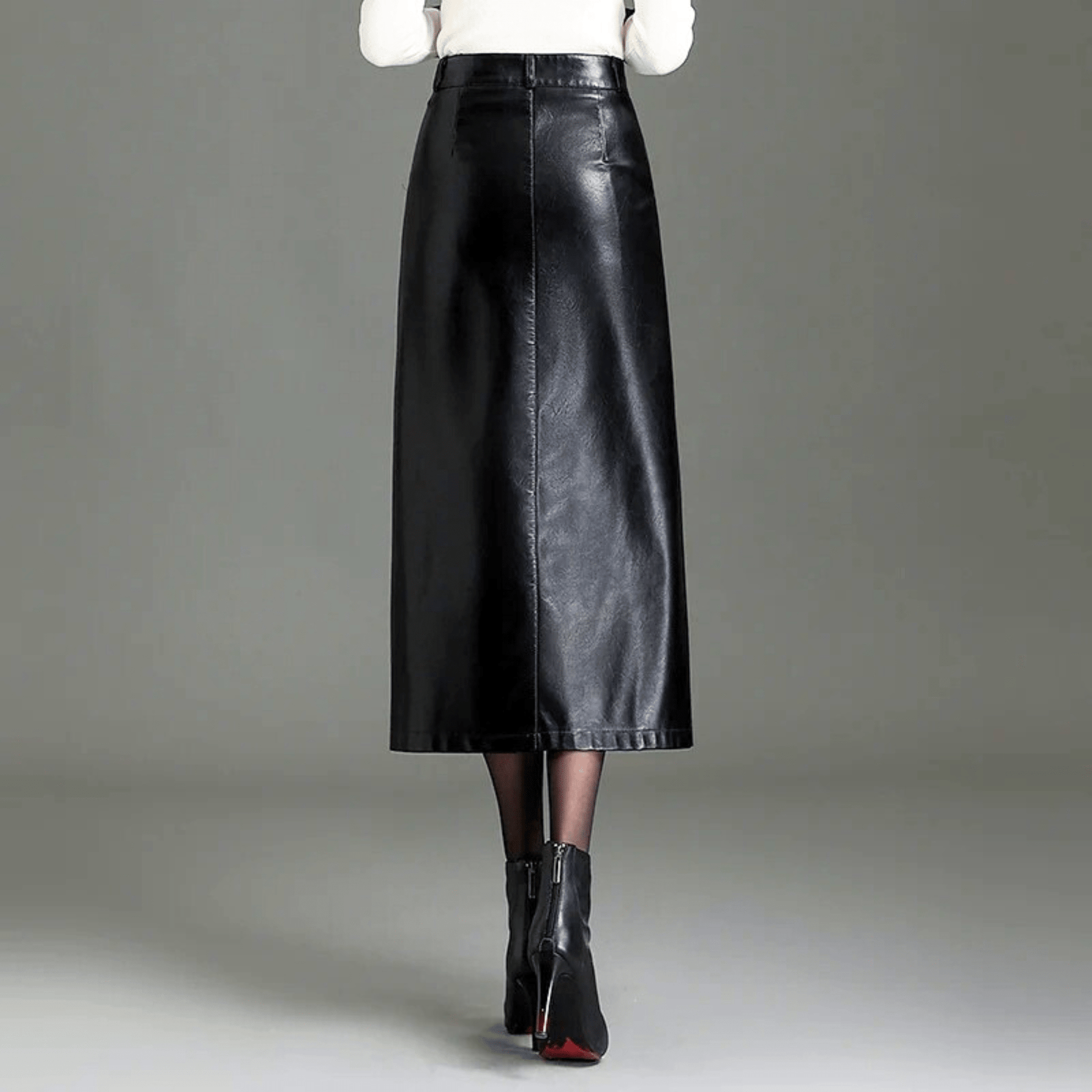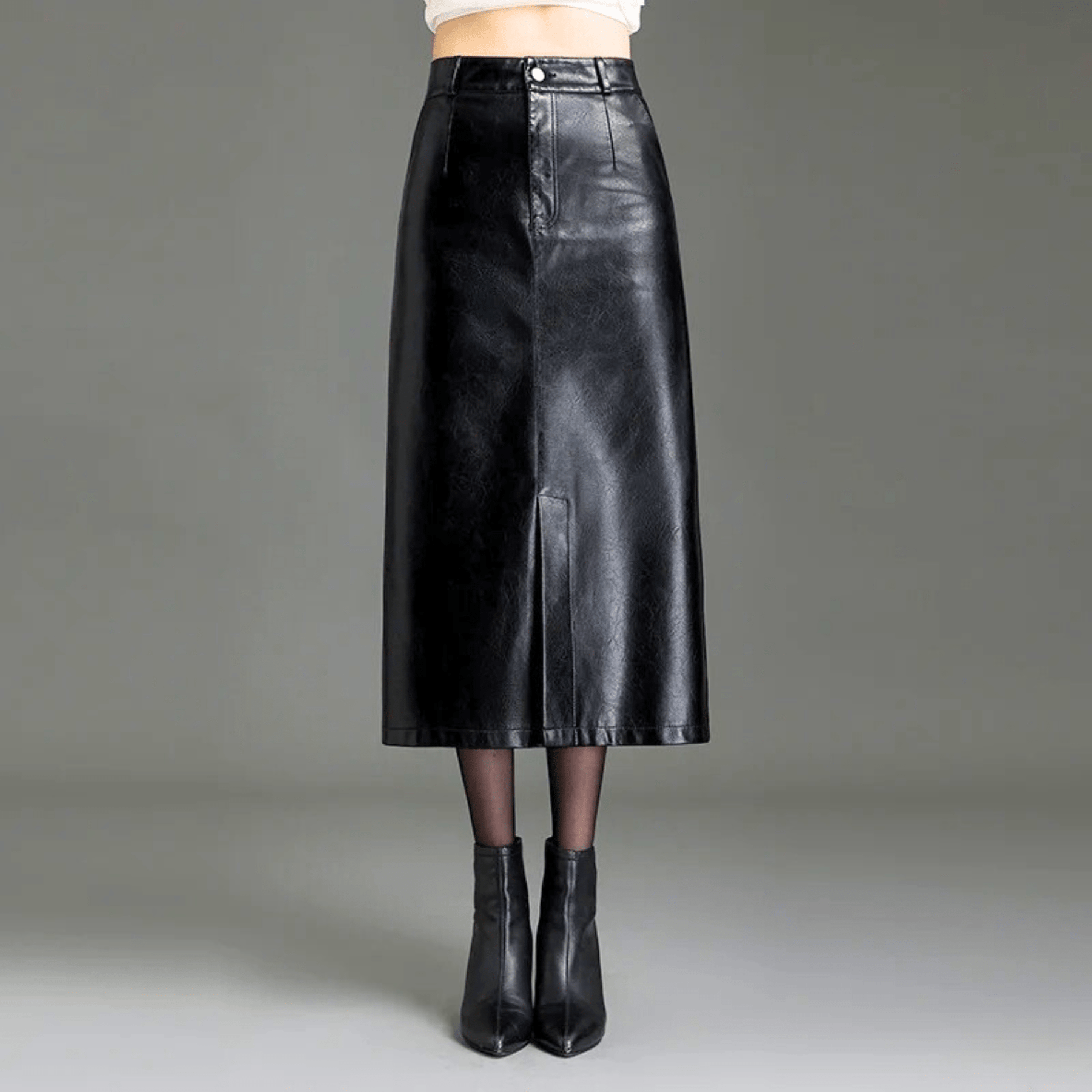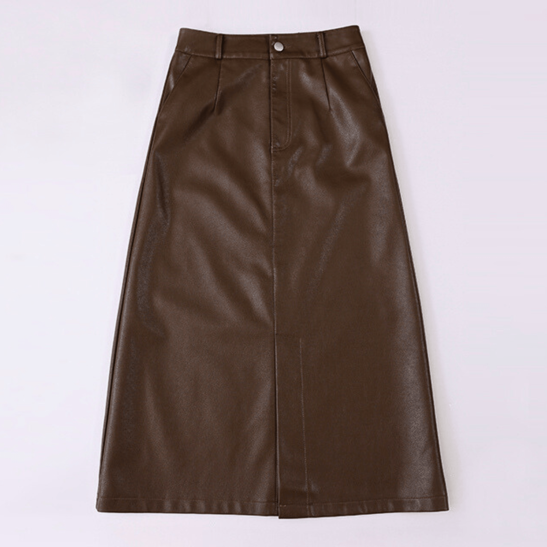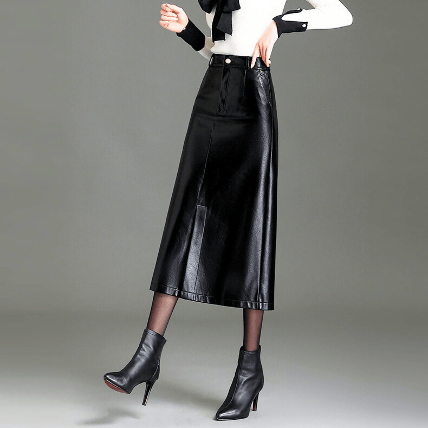 Made from stunning leather with a sleek, high-gloss finish, offering a flattering high-rise fit. With a subtle stretch for comfort, this versatile skirt can be dressed up with heels or styled casually for a chic look.