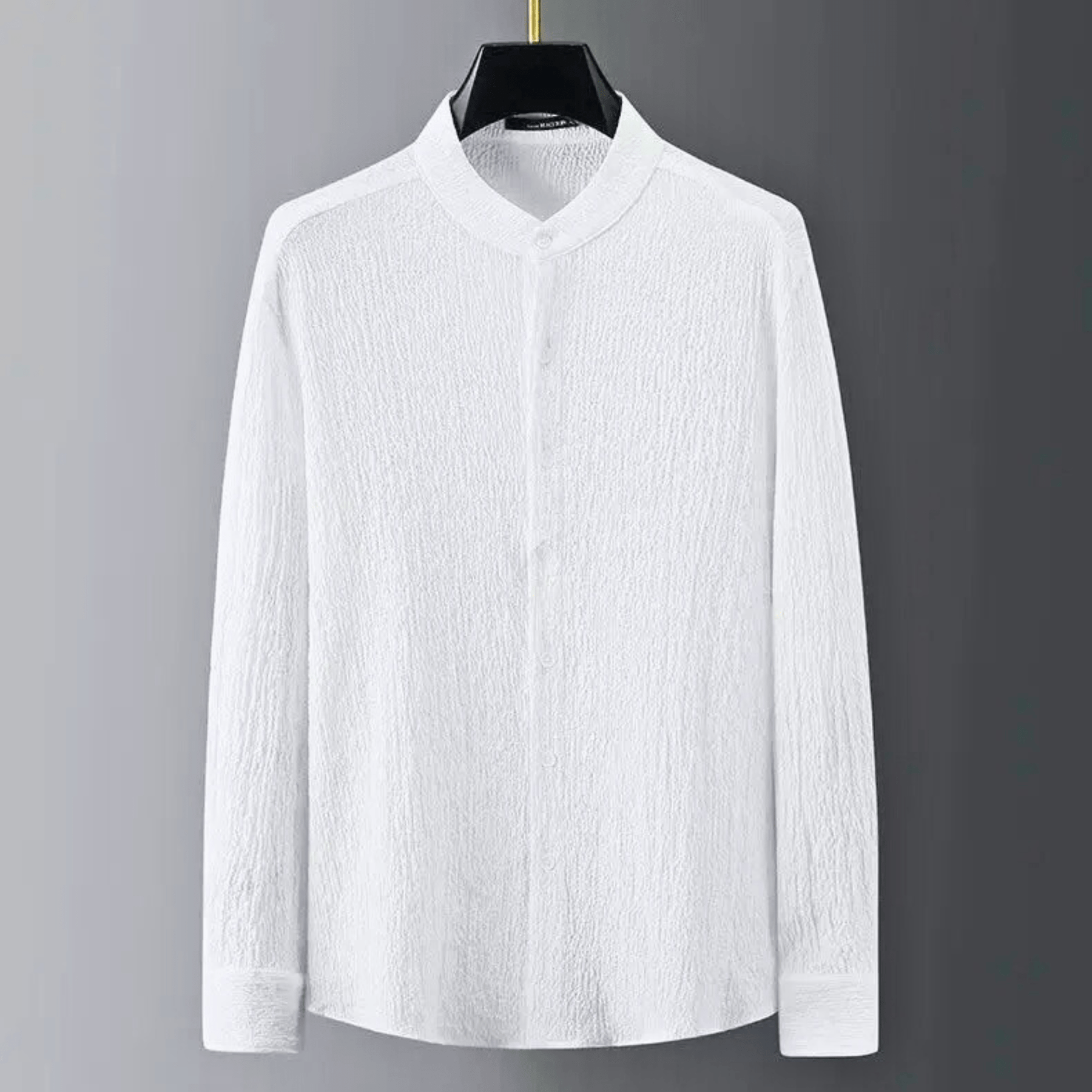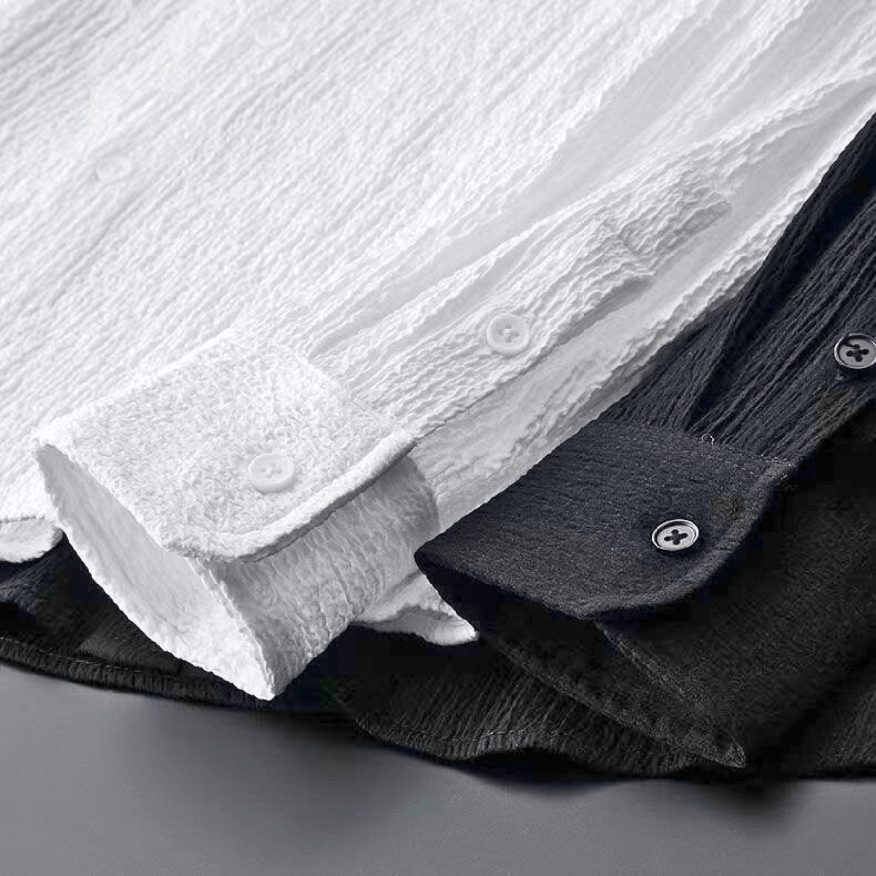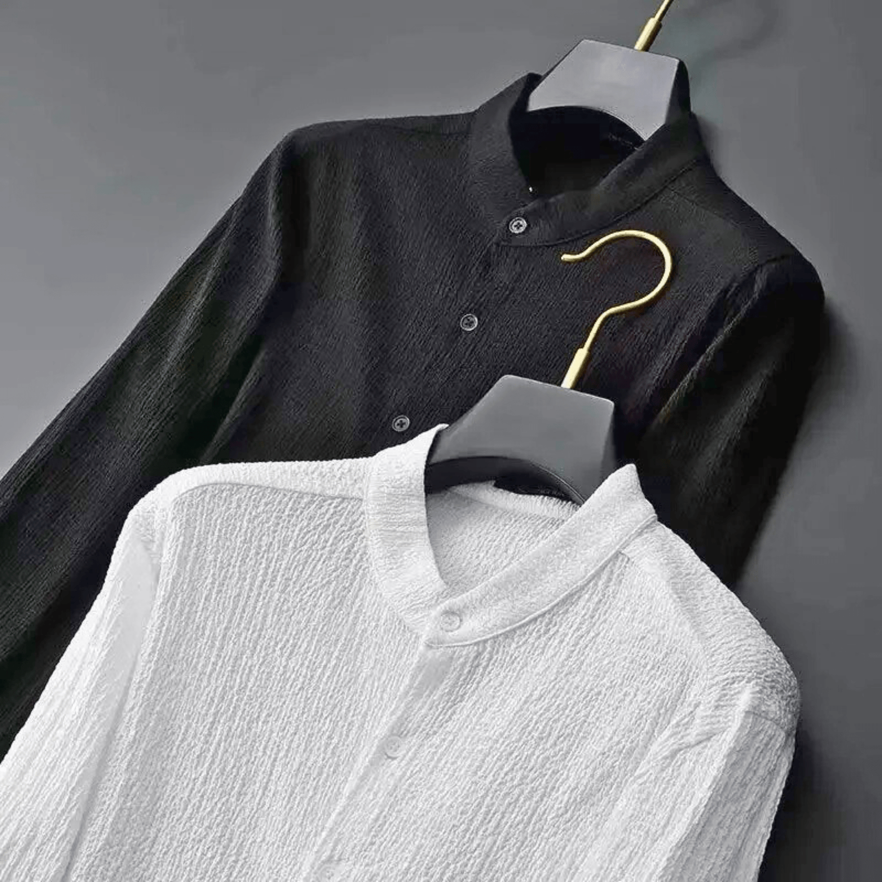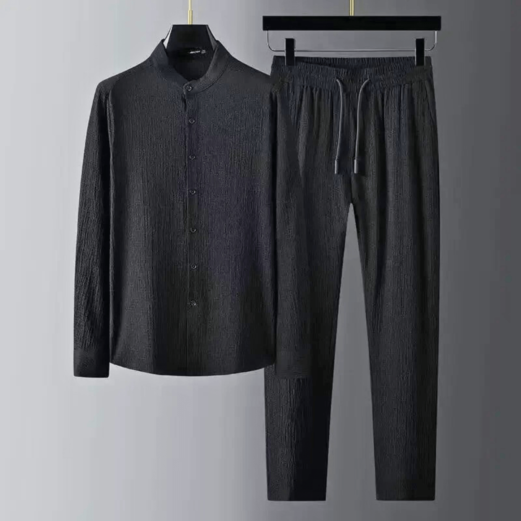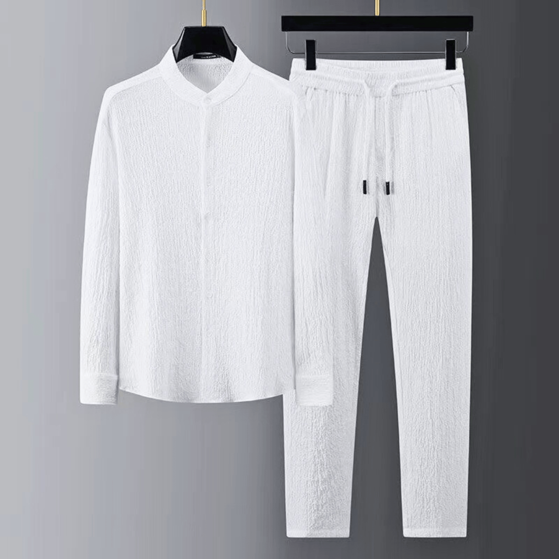 Crafted from breathable seersucker fabric that stays crisp and cool through every season. Featuring a minimalist mandarin-collar shirt and tapered drawstring trousers, this matching ensemble blends Italian-inspired style with relaxed, size-inclusive ease.