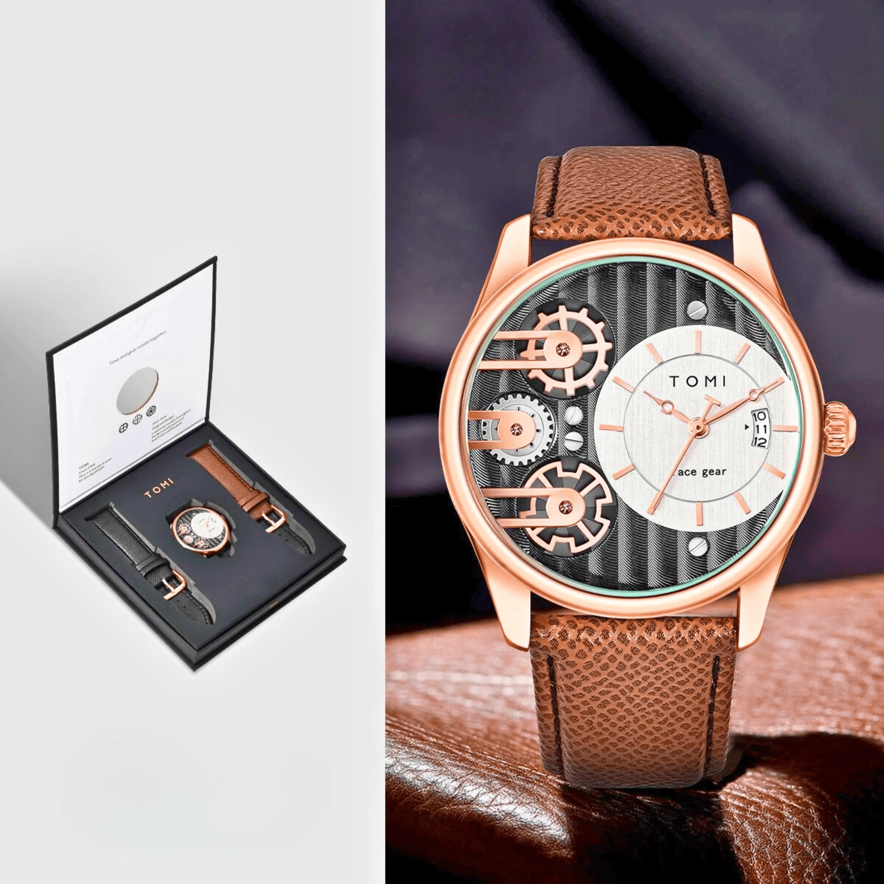 Featuring precision quartz movement and a refined design, this watch is the perfect accessory for the modern man. Presented in a stylish gift box, the set includes two interchangeable leather straps, offering versatility and style for any occasion.