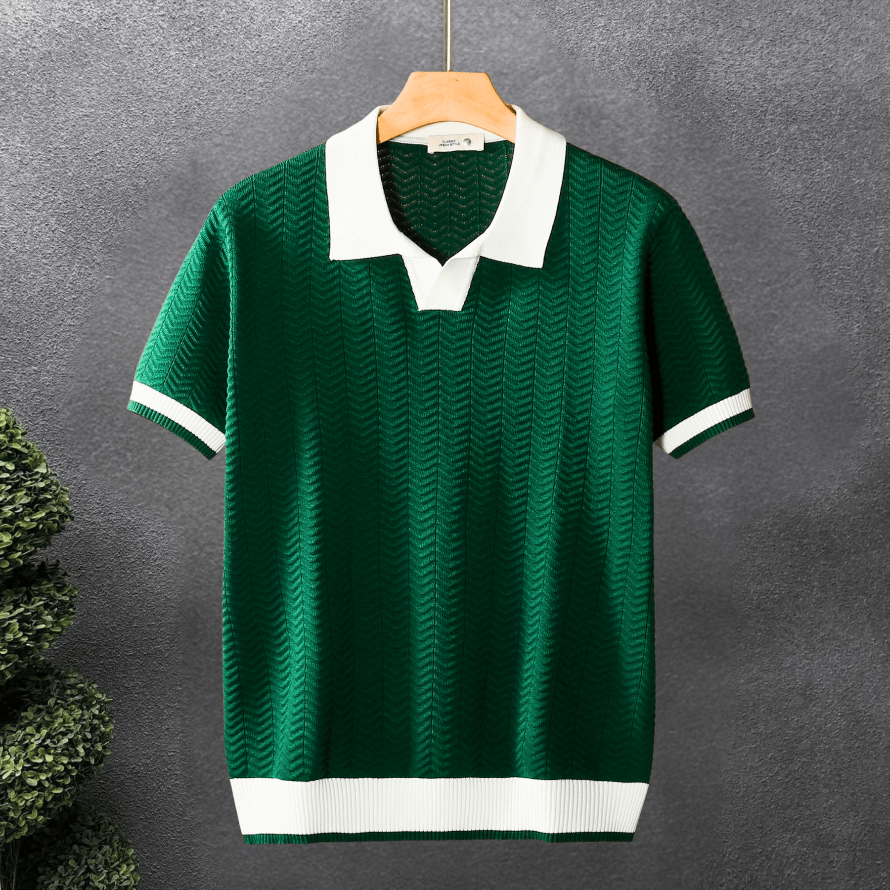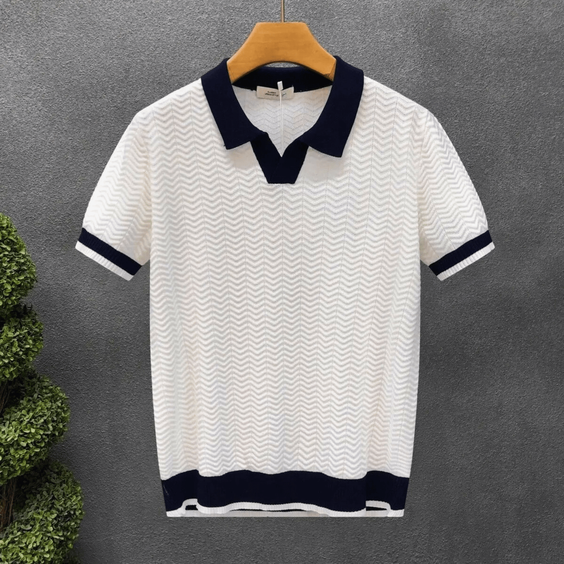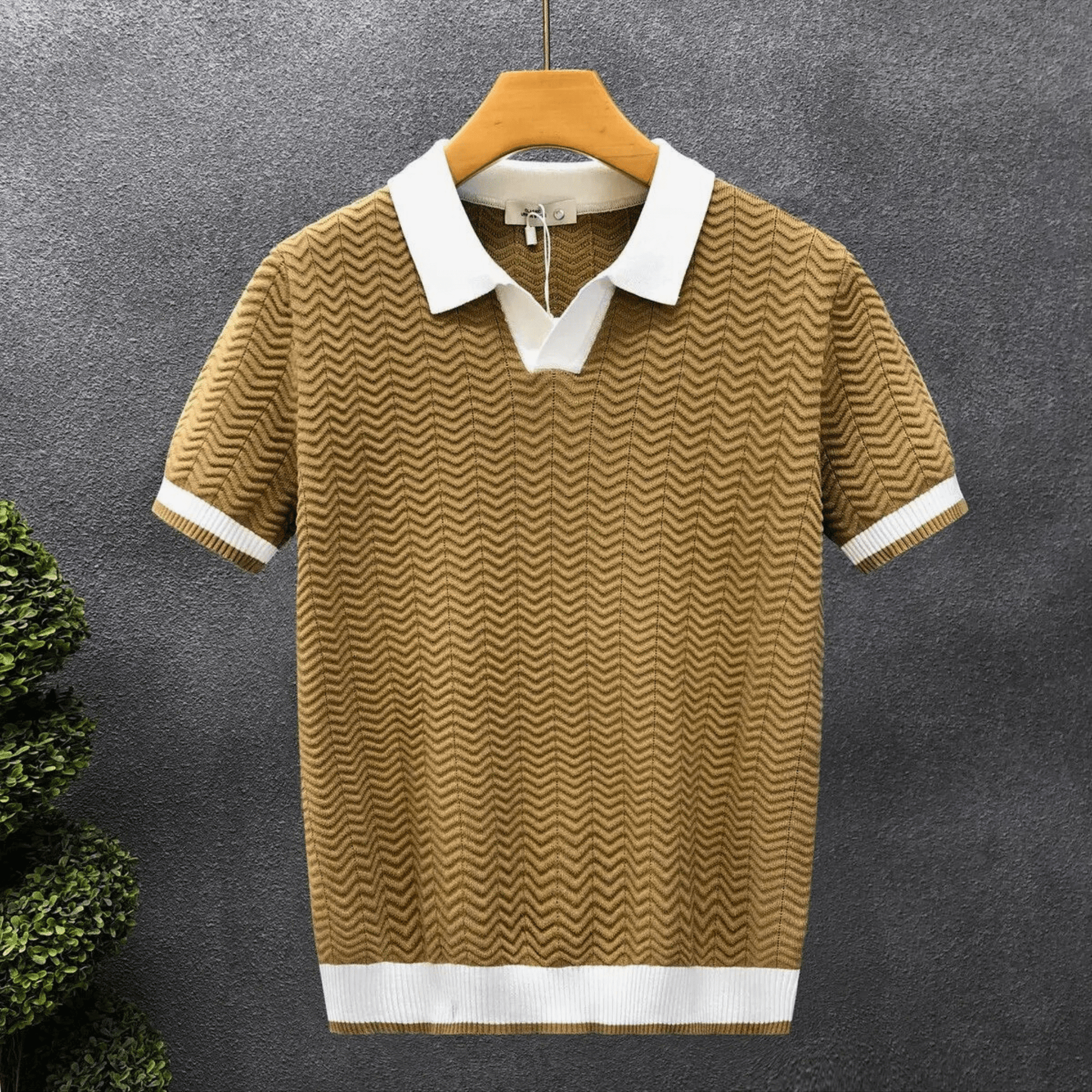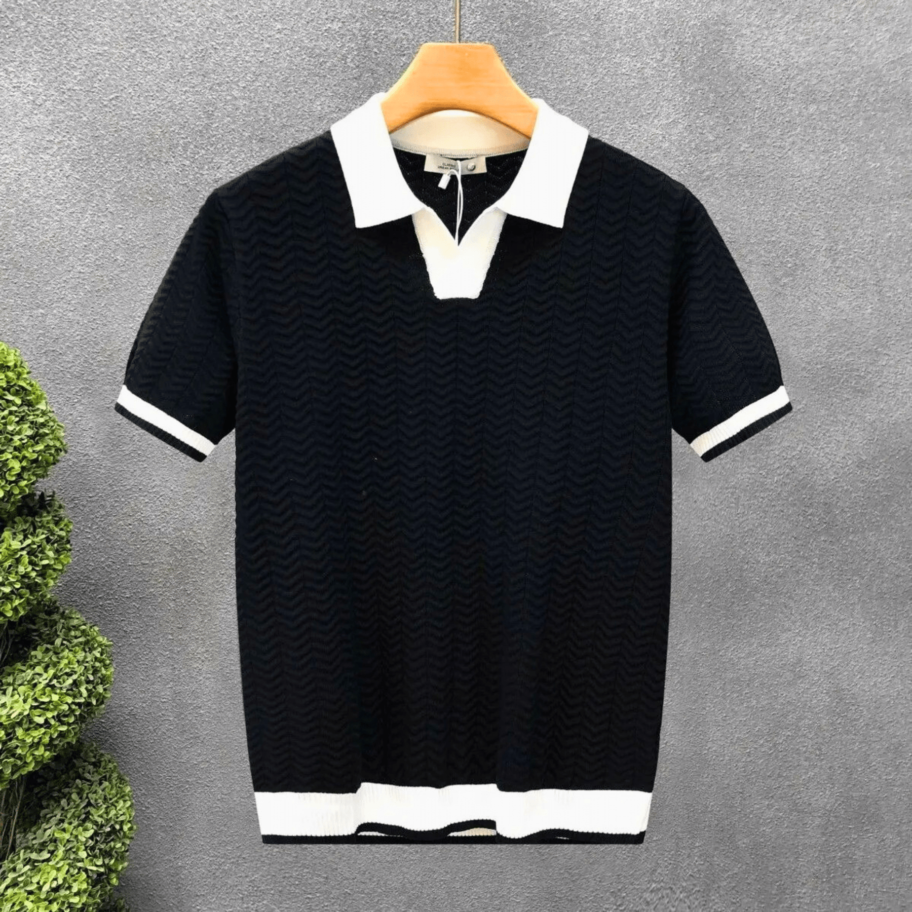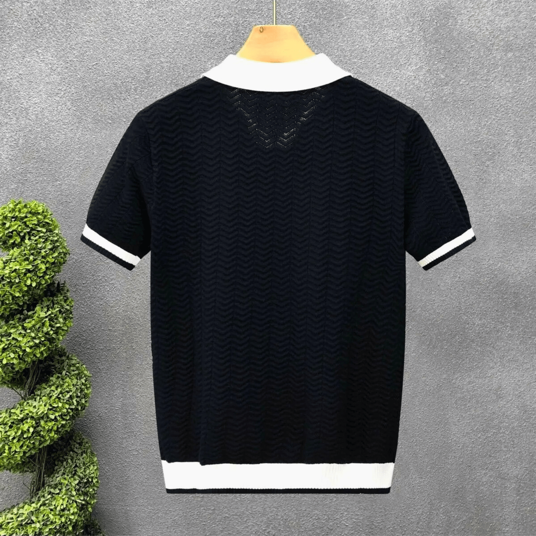 Crafted from breathable jacquard knit with a refined chevron texture, this slim-fit polo delivers elevated style with all-day comfort. Featuring a contrast V-neck collar, stretch-enhanced fabric, and a wrinkle-resistant finish, it’s the perfect choice for effortless summer wear.