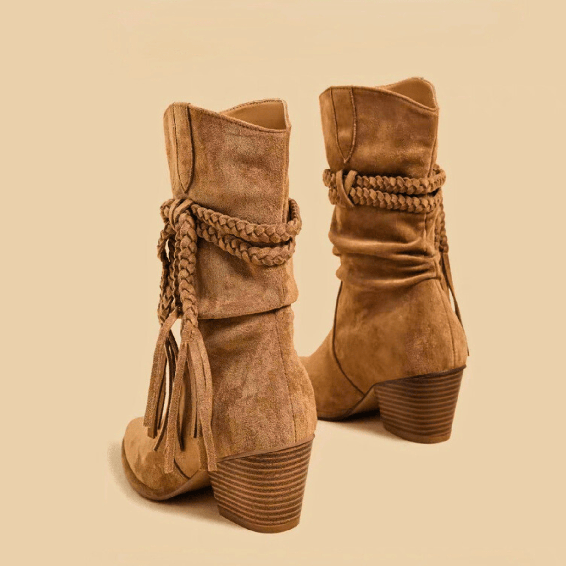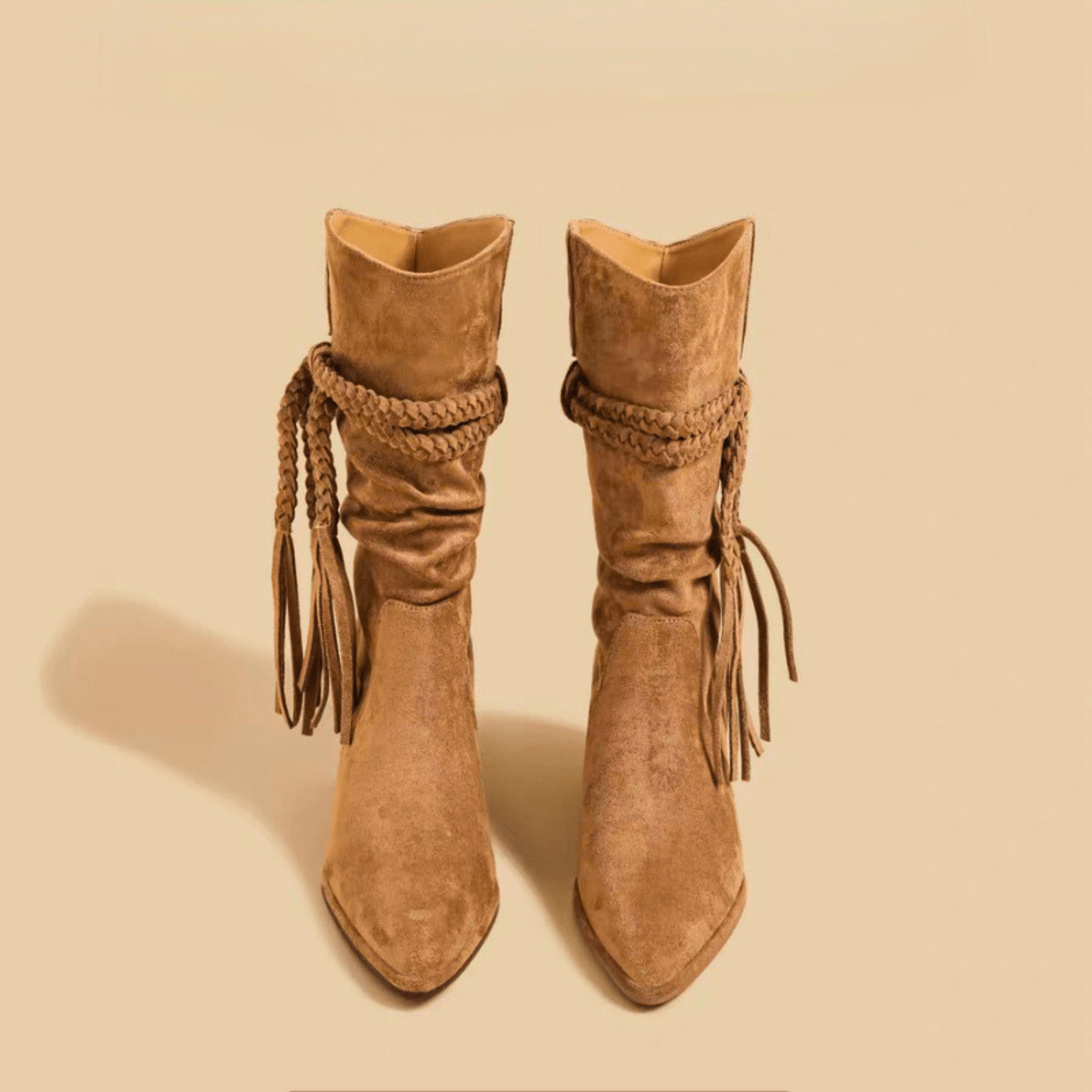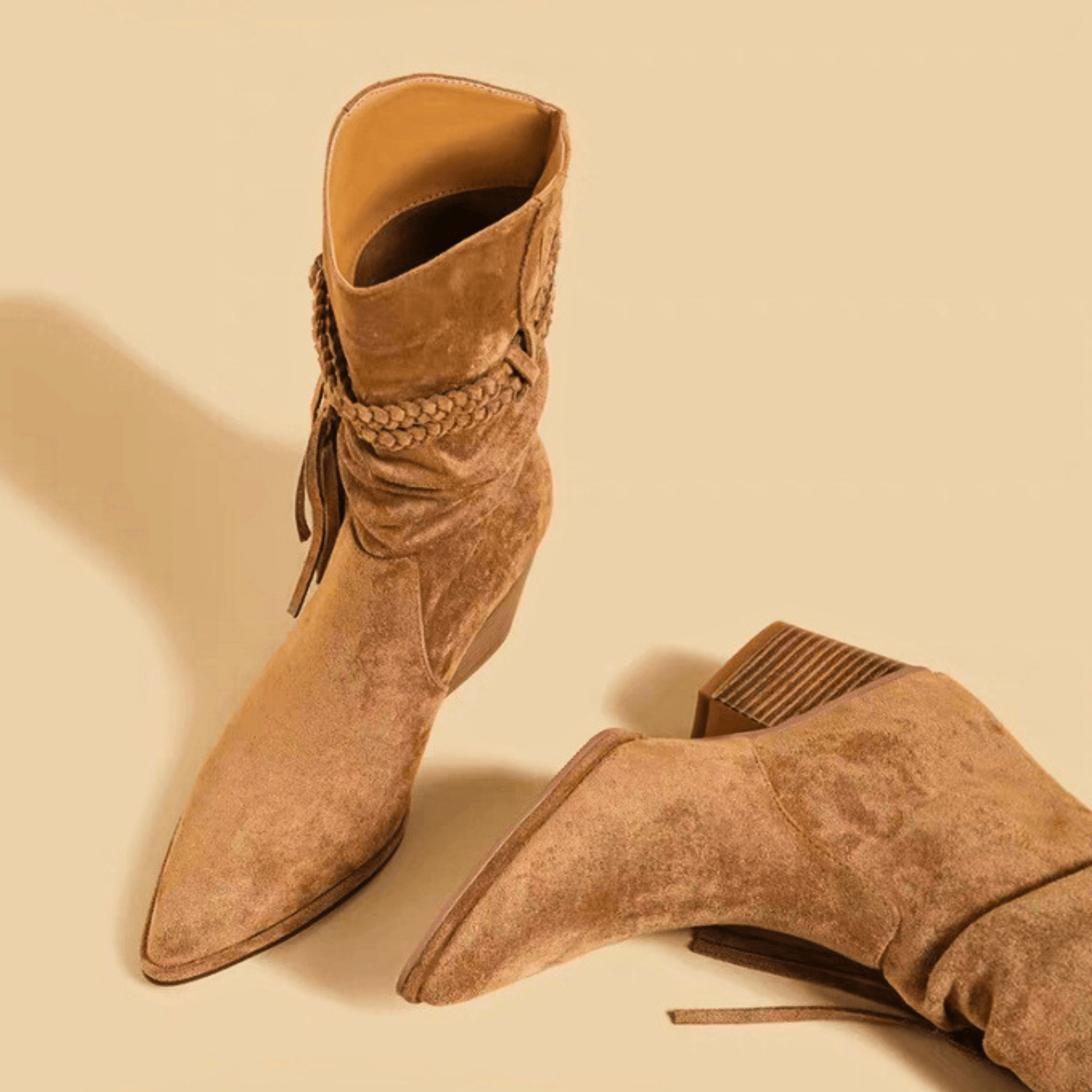 Crafted from soft suede or smooth leather with a braided wrap detail, delivering style and comfort. Defined by its refined pointed toe and stacked heel, it evokes confidence in every step.