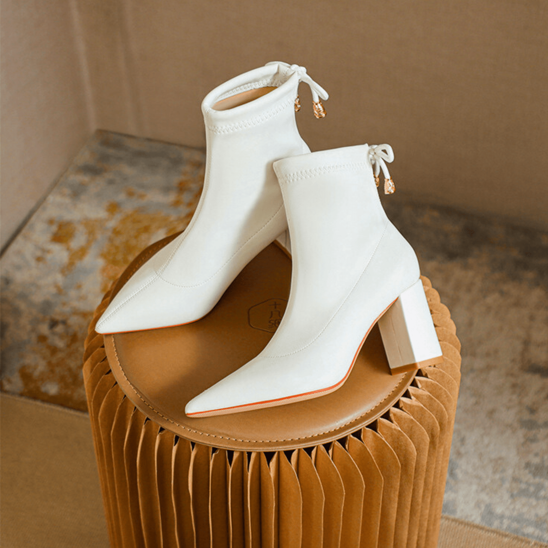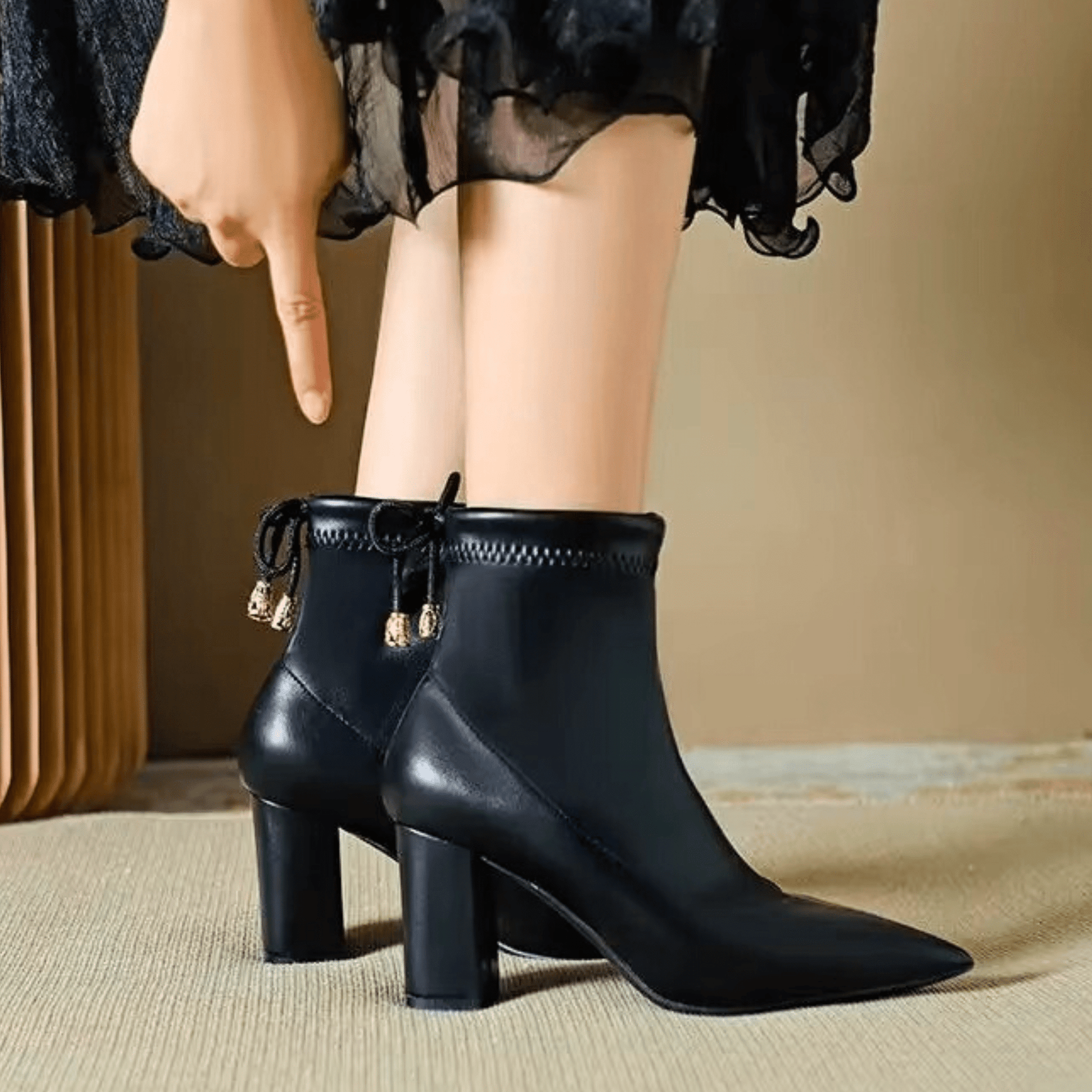 Crafted from premium leather with a sculpted block heel, delivering refined craftsmanship with stylish comfort. Defined by its pointed toe silhouette and gold hardware detail, it embodies confidence in every step.