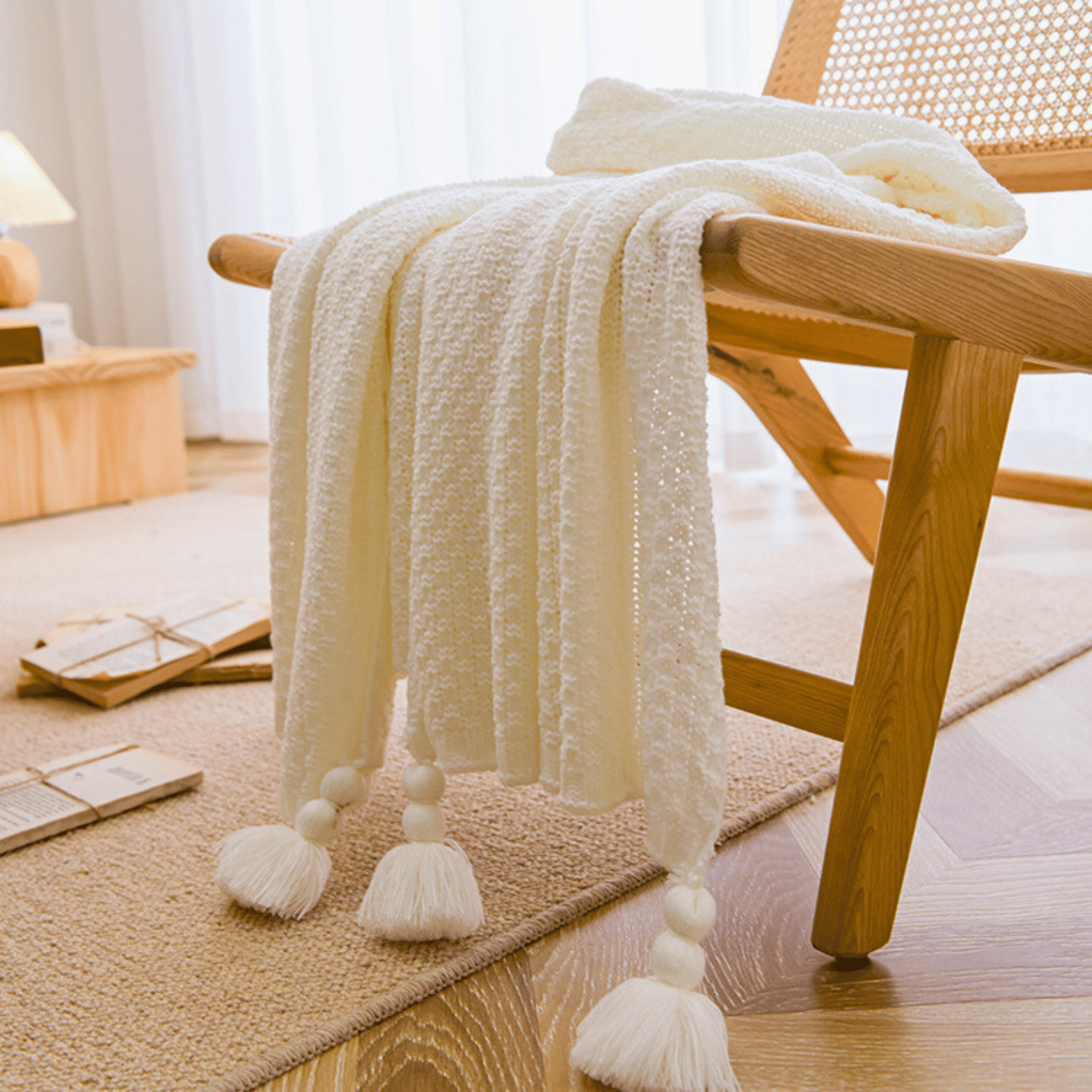 Crafted from soft handwoven cotton with tassel detailing, delivering refined comfort with gentle warmth. Defined by its textured knit and breathable drape, it evokes luxury and serene comfort.