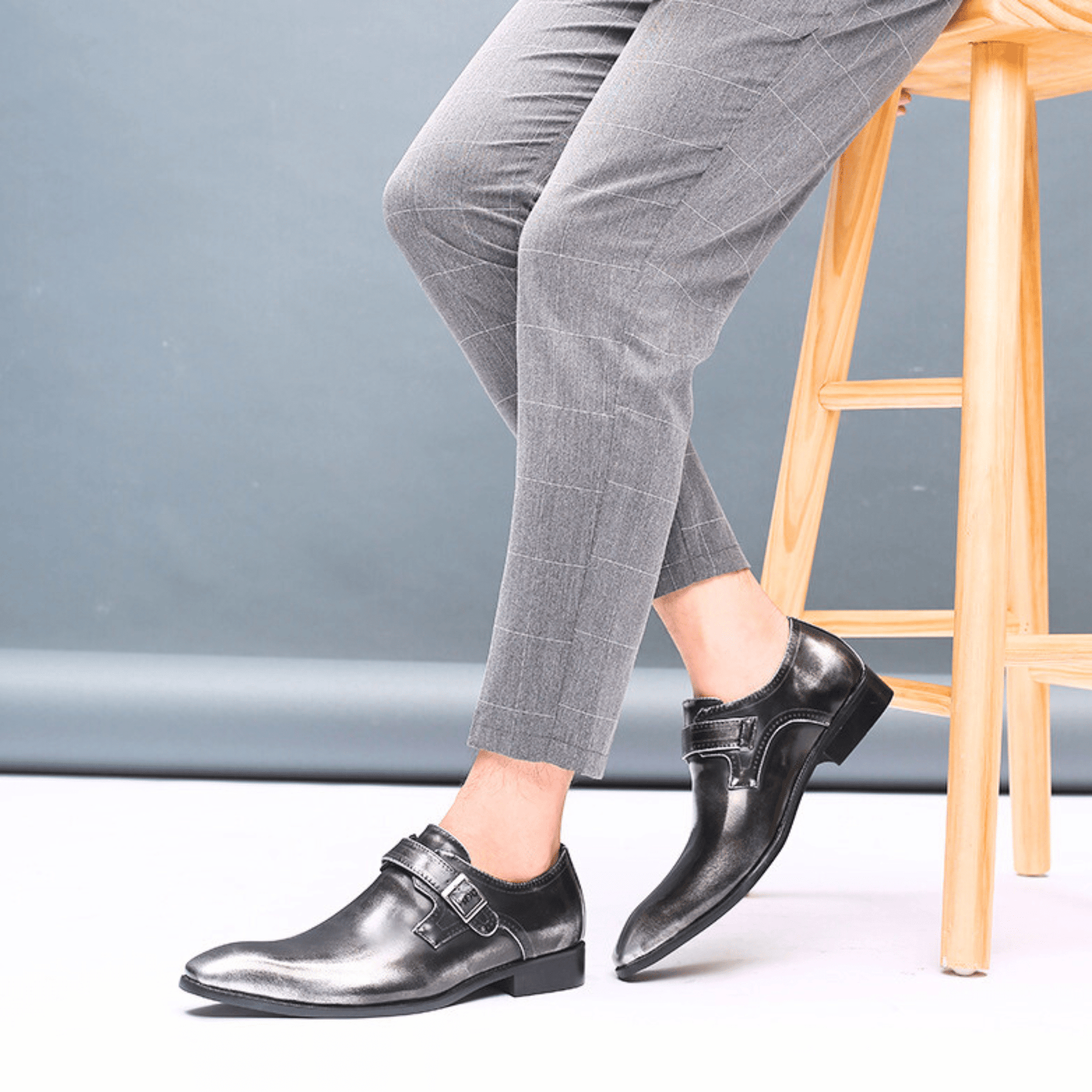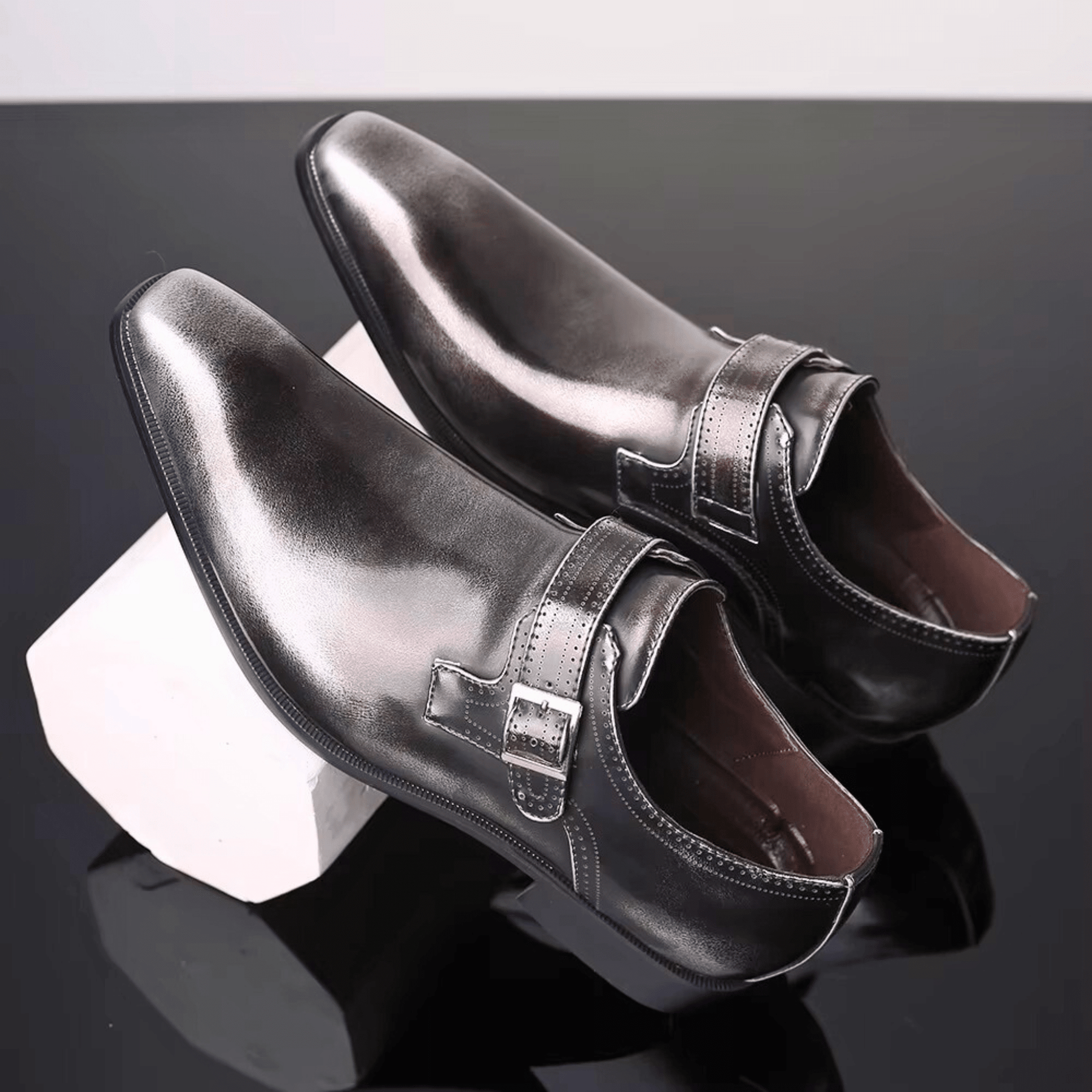 Crafted from polished leather with a sculpted silhouette, delivering elevated craftsmanship and structured comfort. Defined by its elegant almond-toe profile and refined buckle monk strap, it evokes confidence and modern style.
