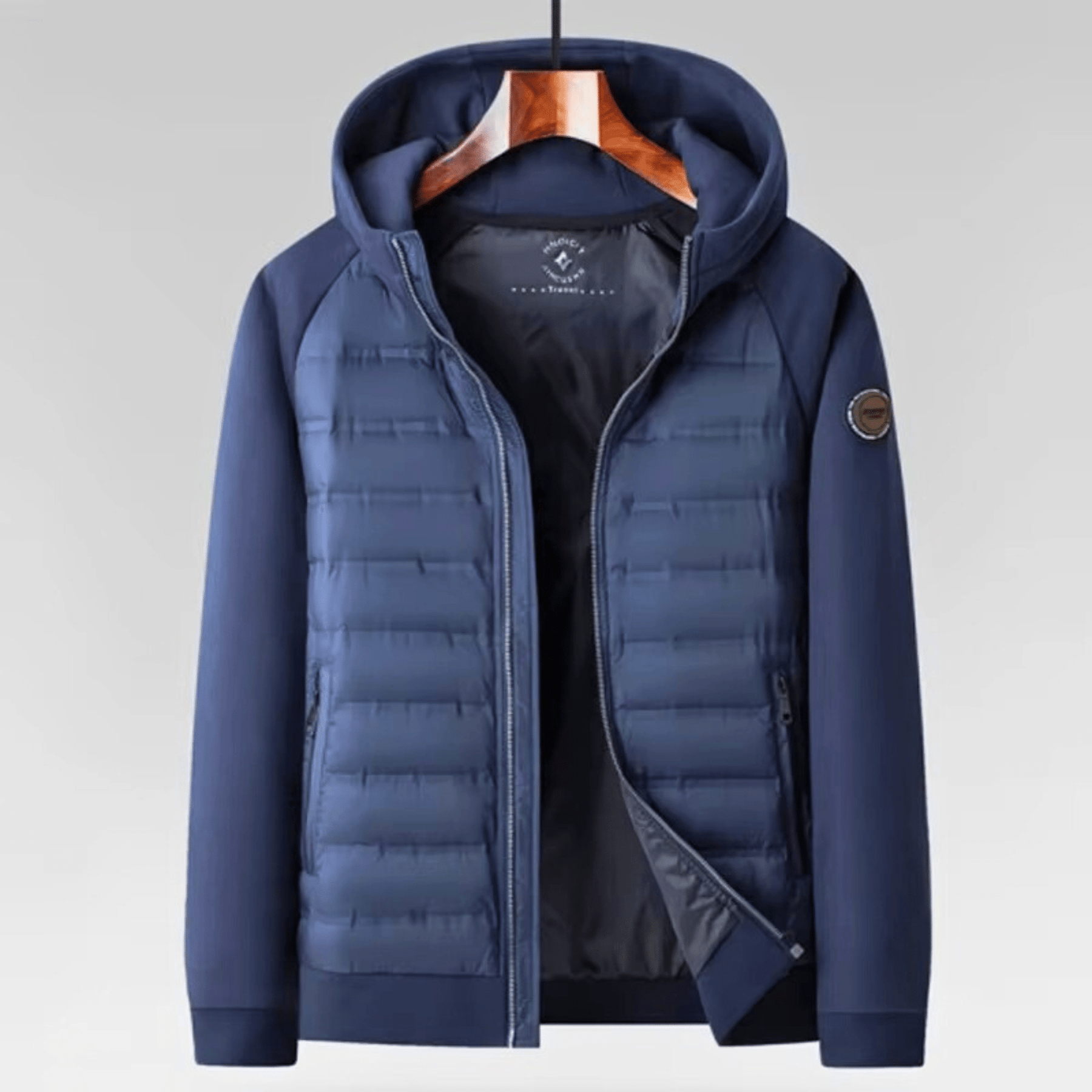 Crafted from lightweight, water-resistant fabric with 90% goose-down fill, delivering exceptional warmth without bulk. Defined by its tailored hybrid design and soft knit detailing, it offers confident comfort to every setting.