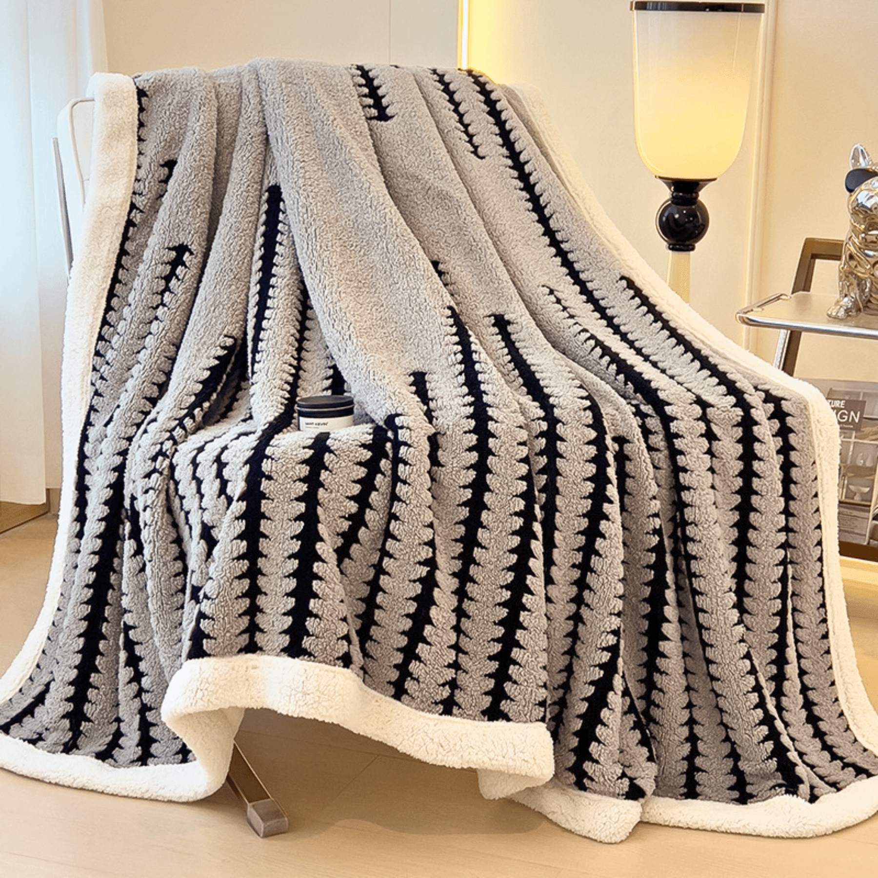 Crafted from ultra-plush sherpa and deep-pile fleece, delivering exceptional warmth with a soft indulgent feel. Defined by its geometric patterns and premium drape, it evokes refined comfort and quiet luxury.