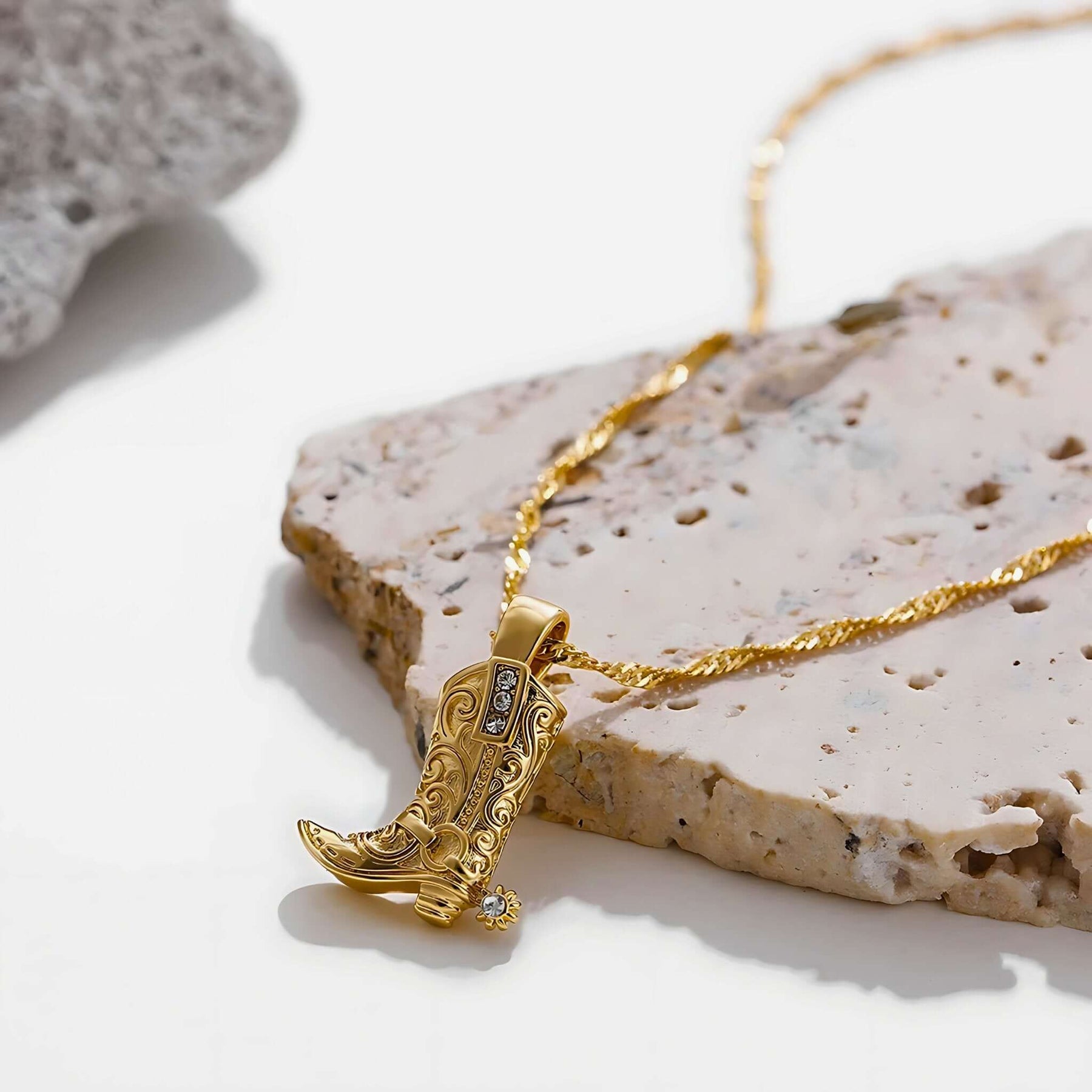 Featuring a beautifully detailed cowboy boot pendant, this necklace ensures a stunning and timeless look. It’s the perfect gift for lovers of Western fashion and cowgirls alike.