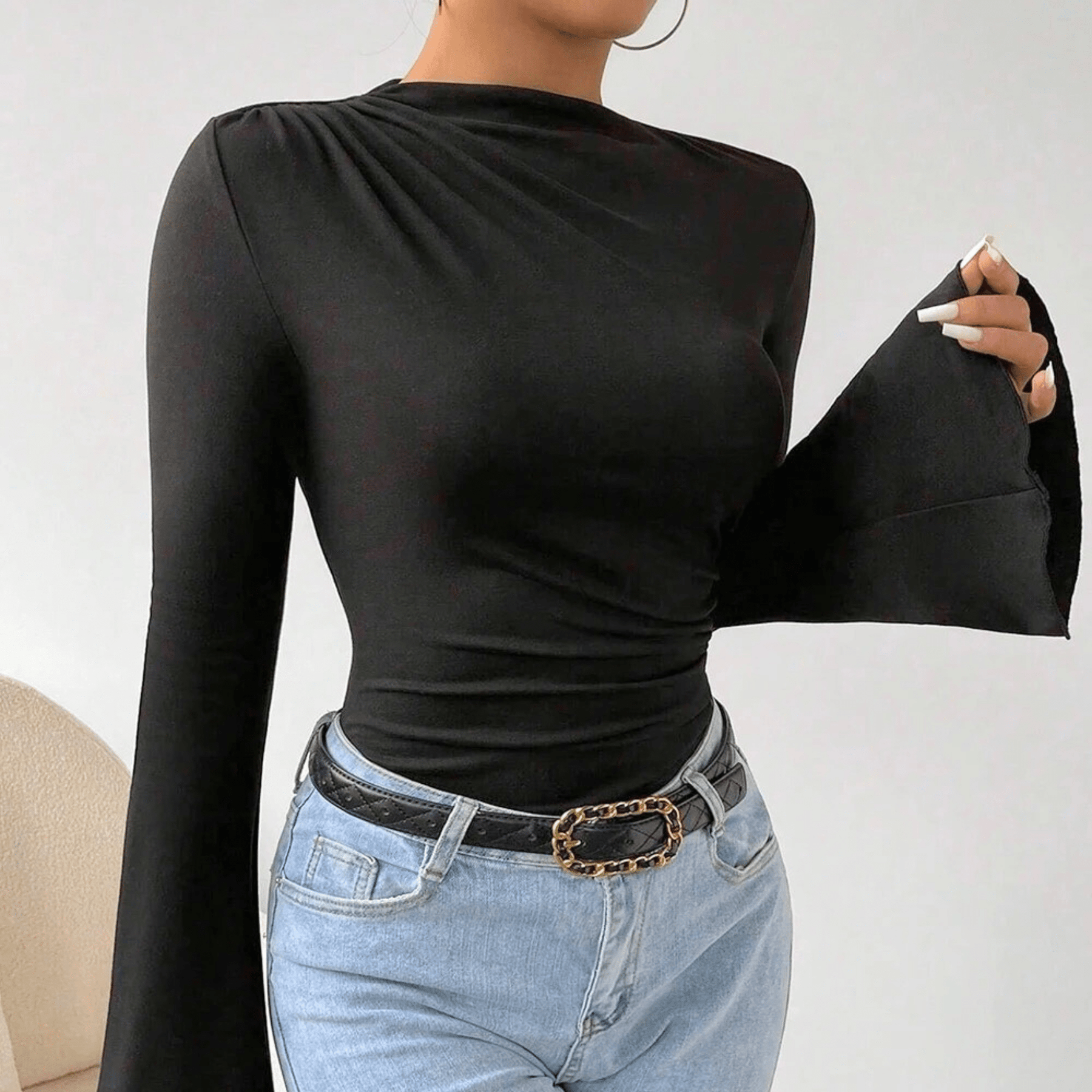 Designed to flatter your silhouette with elegant bell sleeves and a sleek, figure-hugging fit, this versatile bodysuit transitions seamlessly from casual chic to evening glam.